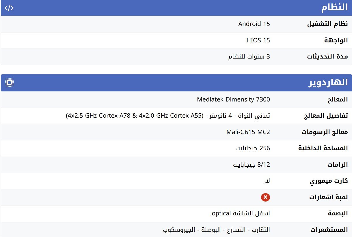- نظام التشغيل اندرويد 15 بينما واجهة المستخدم HIOS 15 مع دعم لمدة ثلاث سنوات تحديثات للنظام.