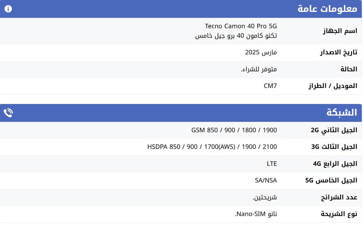 Tecno Camon 40 Pro 5G تم إطلاقه في مارس 2025 إلى جانب تكنو كامون 40 بريمير. هذا الهاتف يعتمد على معالج ميدياتك 7300 الذي يدعم شبكات الجيل الخامس ويمكن تركيب شريحتين. كما يستخدم شاشة اموليد مقاس 6.78 بوصة عالية الدقة بمعدل تحديث 120 هرتز. بالإضافة إلى ذلك يدعم كاميرا اساسية 50 ميجابكسل وكاميرا امامية 50 ميجابكسل. سنتحدث عن مواصفات الجوال والمميزات او العيوب الموجودة به ويمكن متابعة السعر في الأسواق بمساعدة جدول الأسعار.