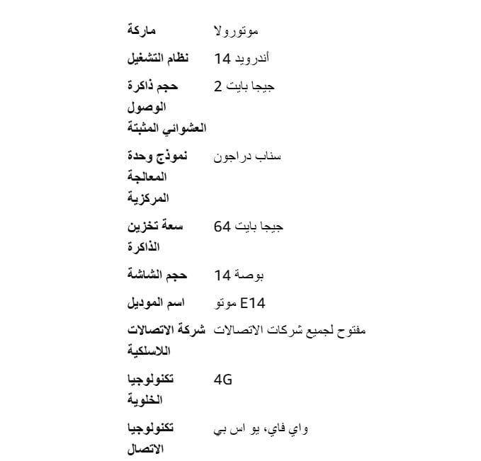 موتورولا E14 XT2421-14 64GB+2GB DS 4G رمادى جرافيت عربي، شاشة 6.6 بوصة، دقة الكاميرا - كاميرا أمامية 13 ميجابكسل وكاميرا أمامية 5 ميجابكسل، بطارية 5000 مللي أمبير، نظام تشغيل أندرويد 14 (إصدار Go)، يدعم شريحة SIM - شريحتي اتصال (2 Nano SIM + 1 microSD)، ذاكرة وصول عشوائي - 2 جيجابايت ذاكرة وصول عشوائي، قابلة للتوسعة حتى 4
